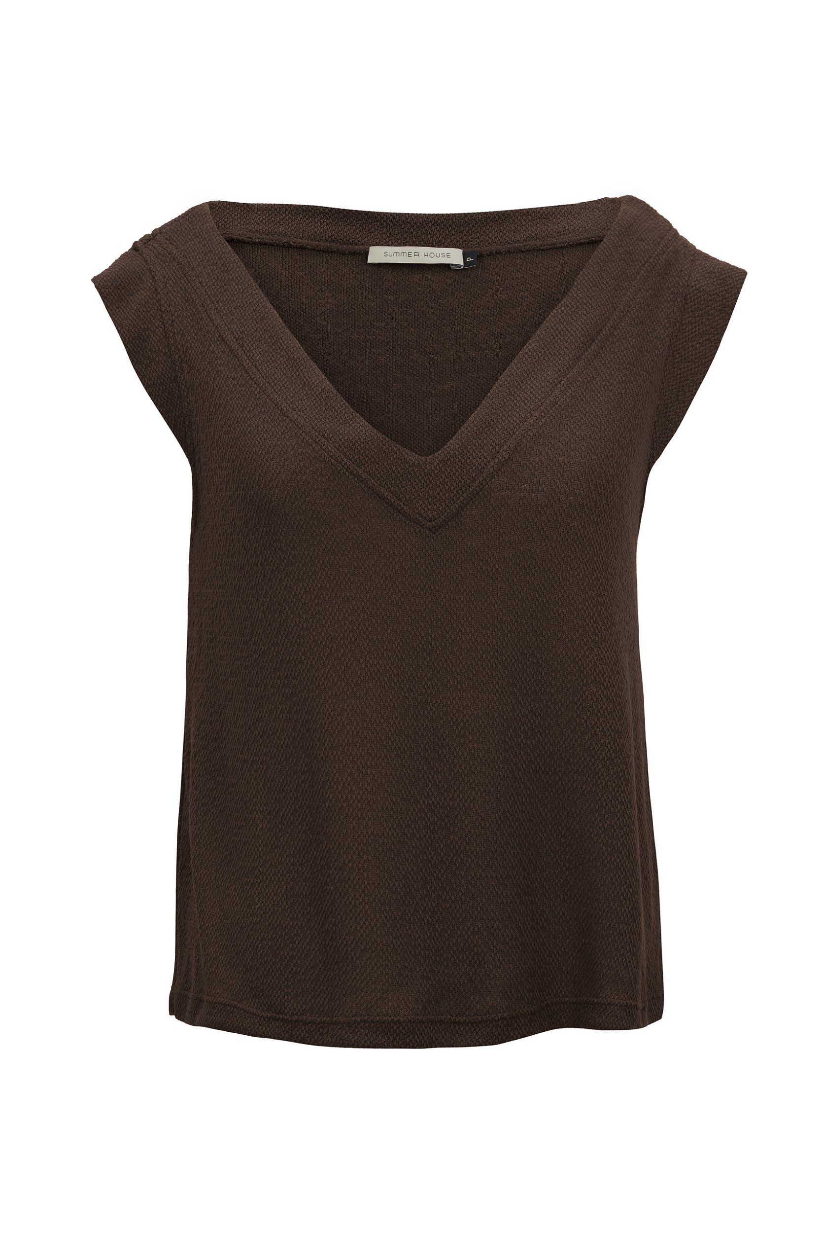 Blusa com modelagem solta, manga curta e com decote V. Confeccionada em malha com aspecto de tricot, com viscose na composição. Não possui forro.