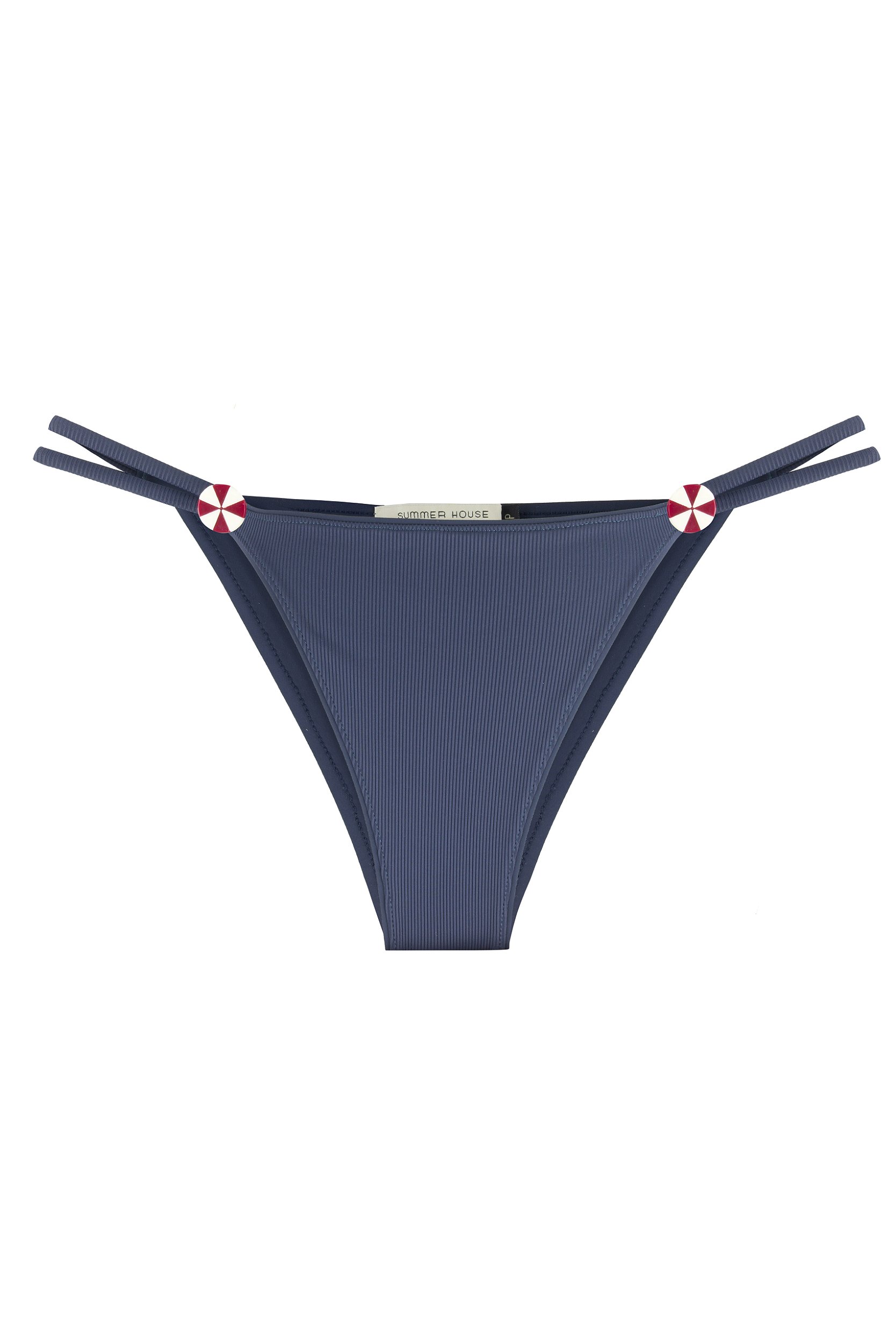 Calcinha com passantes de marchetaria manual em acrílico. Latetais com 2 tiras sem regulagem. Confeccionada em tecido com textura listrada, composto por poliamida e elastano.