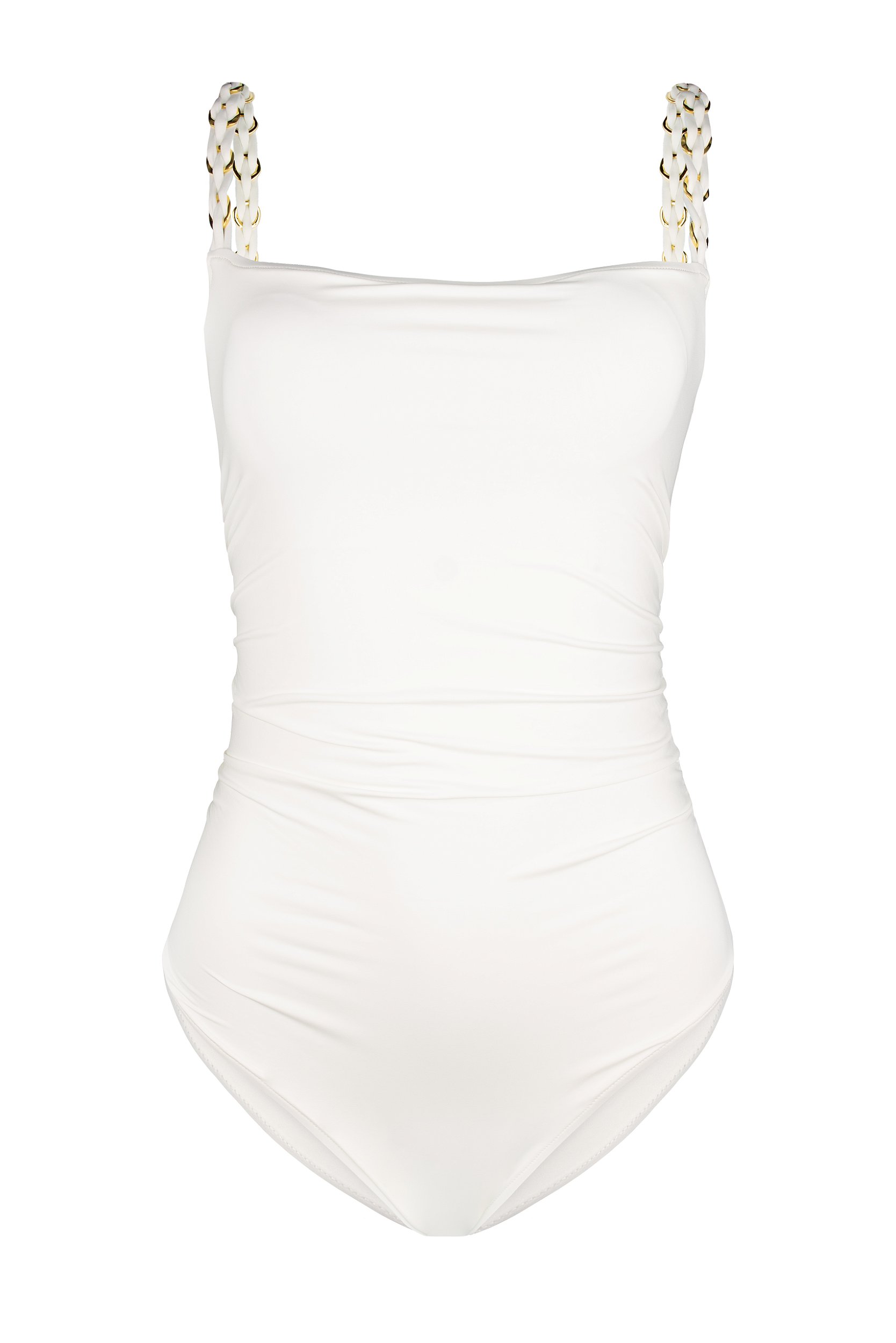Maiô com decote reto e franzido nas laterais do corpo. Alças com detalhe feito à mão, de argolas de metal na cor ouro entrelaçadas com tecido. Possui bojo removível. Confeccionado em tecido macio e confortável, de rápida secagem, composto por poliamida e elastano. Possui forro triplo.