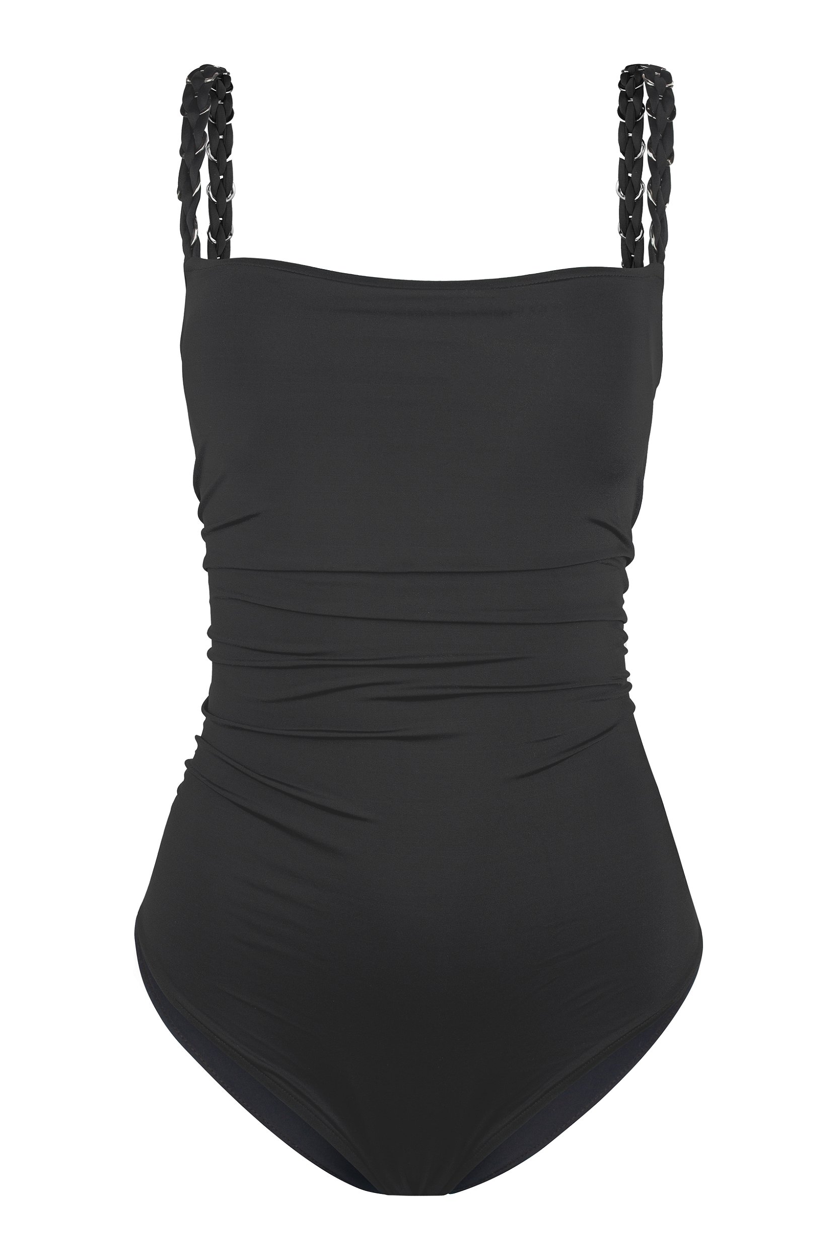 Maiô com decote reto e franzido nas laterais do corpo. Alças com detalhe feito à mão, de argolas de metal na cor ônix entrelaçadas com tecido. Possui bojo removível. Confeccionado em tecido macio e confortável, de rápida secagem, composto por poliamida e elastano. Possui forro duplo.
