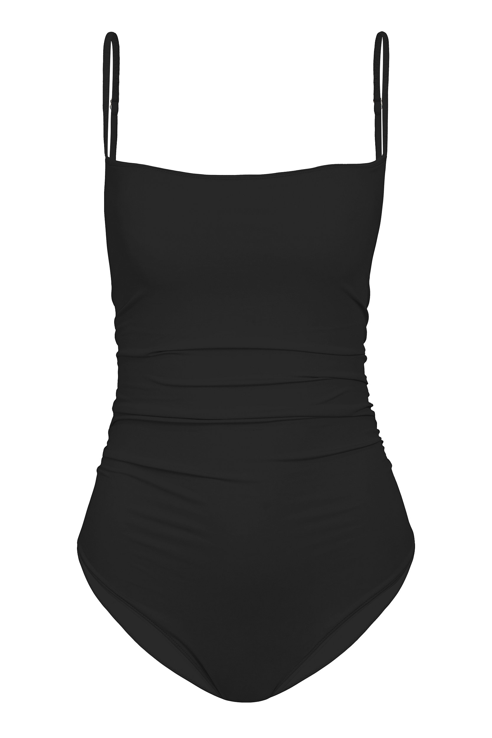 Maiô com decote reto e franzido nas laterais. Possui bojo removível. Confeccionado em tecido macio e confortável, de rápida secagem, composto por poliamida e elastano.
