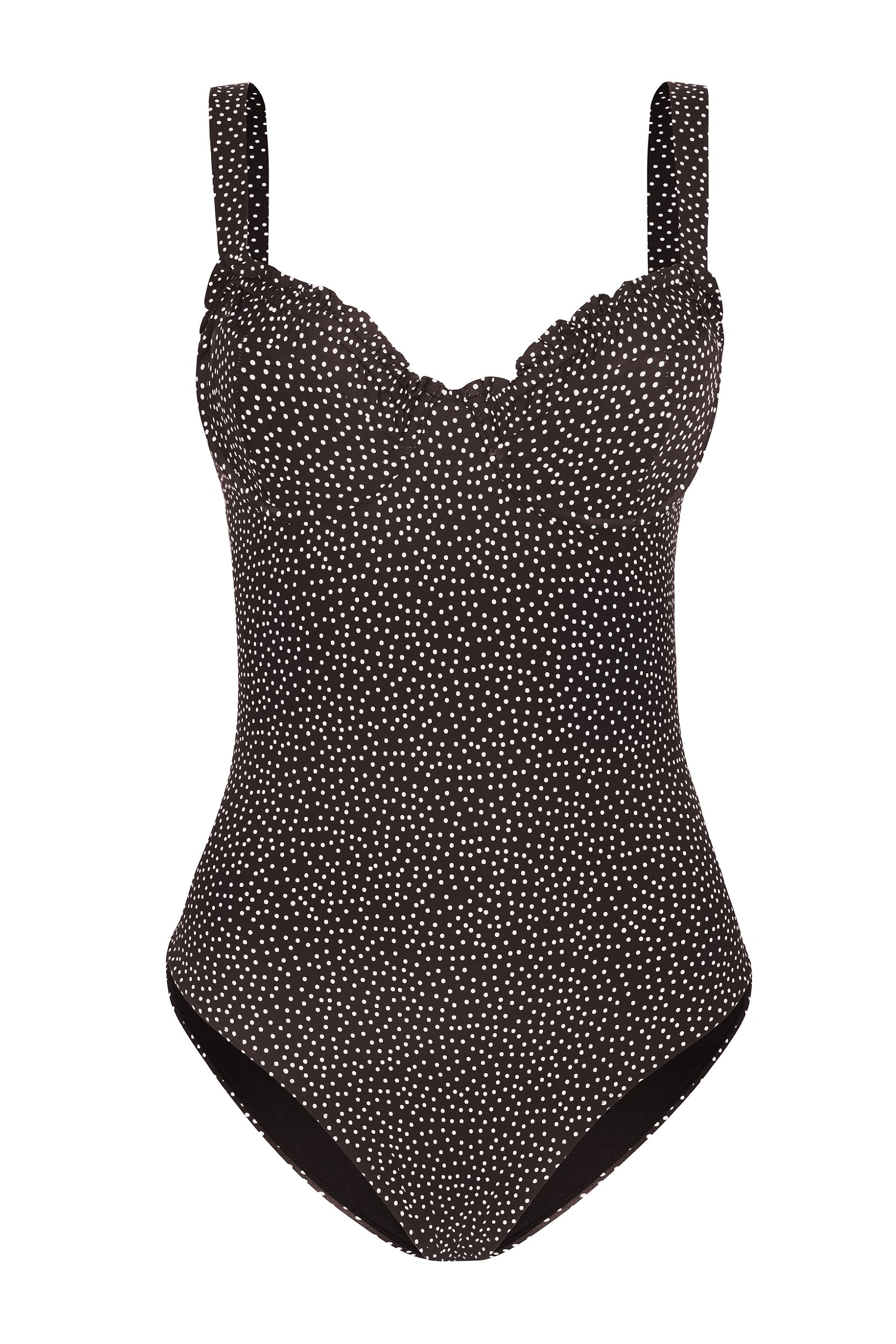 Maiô meia-taça estampado com detalhe especial de franzido no busto. Alças largas e reguláveis. Ajuste das costas por laço. Não possui bojo. Confeccionado em tecido macio e confortável, de rápida secagem, composto por poliamida e elastano. Possui forro duplo.