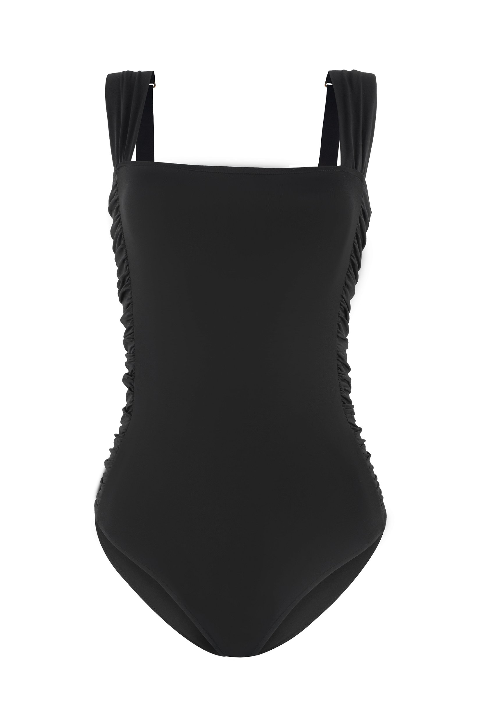 Maiô liso com decote quadrado, alças largas e reguláveis. Recorte nas laterais com leve drapeado e decote em V nas costas. Possui bojo removível. Confeccionado em tecido macio e confortável, de rápida secagem, composto por poliamida e elastano. Possui forro duplo.