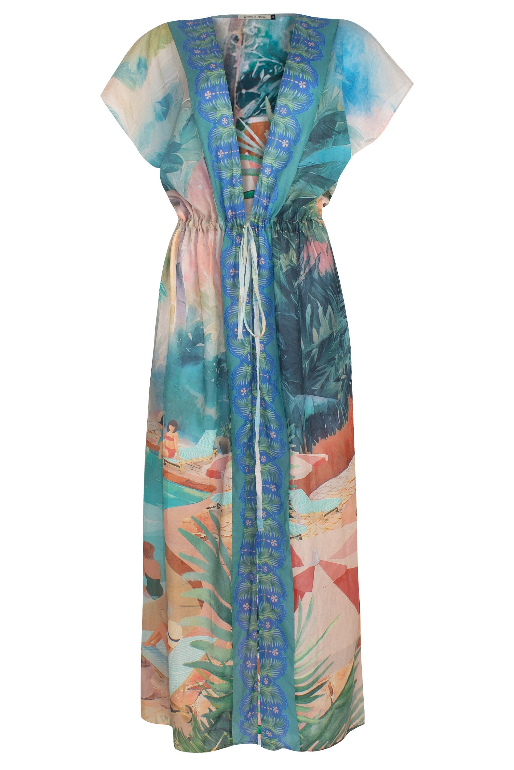 Saída de praia com a Ilustração exclusiva La Piscine. Permite diversas amarrações, transpassada ou aberta. Confeccionada em voil, tecido super leve de algodão.
