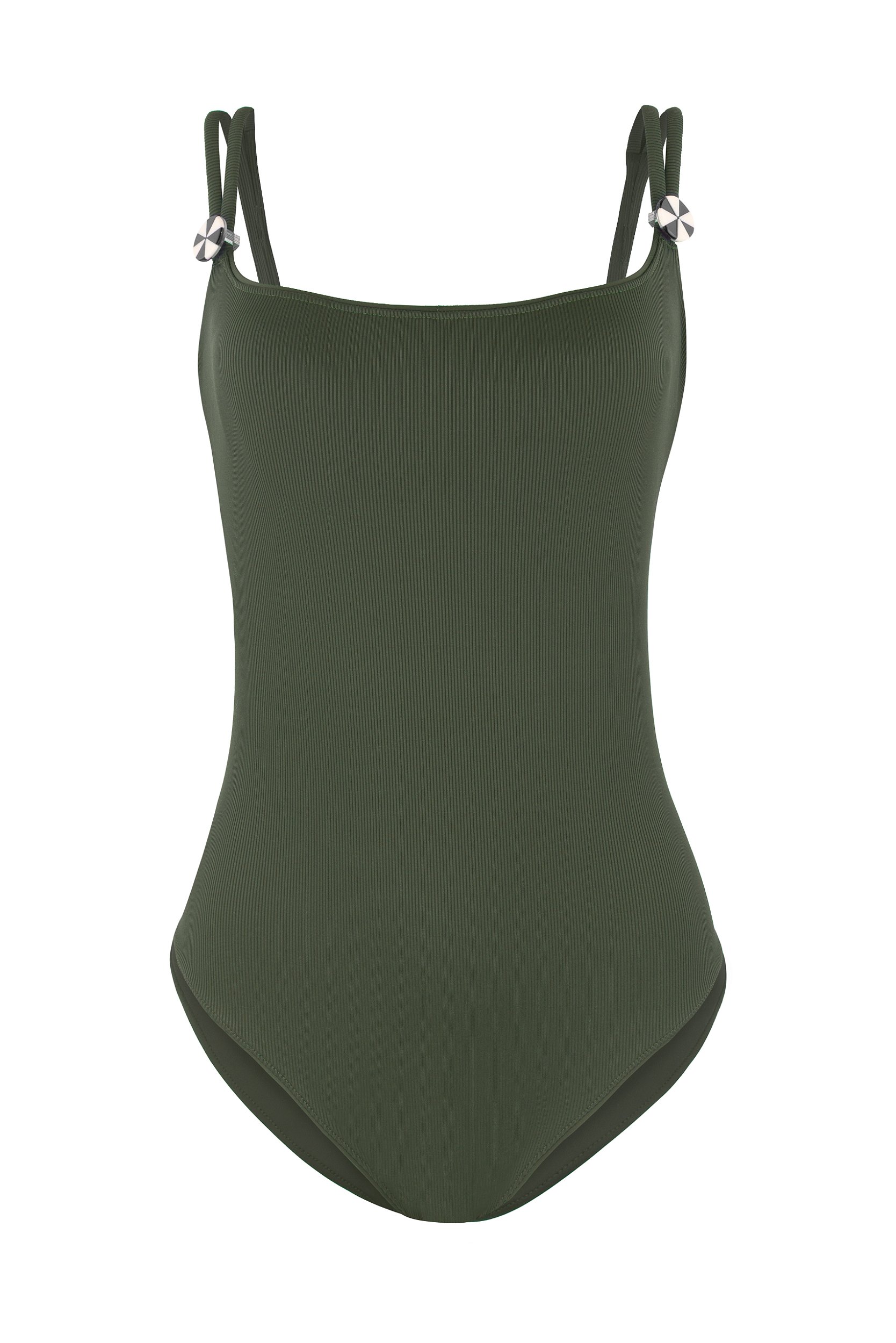 Maiô com passantes de marchetaria manual em acrílico nas alças. Modelagem com decote reto frontal e alças duplas que ajustam o decote das costas, com regulagem por laço. Possui bojo removível. Confeccionada em tecido com textura listrada, composto por poliamida e elastano.
