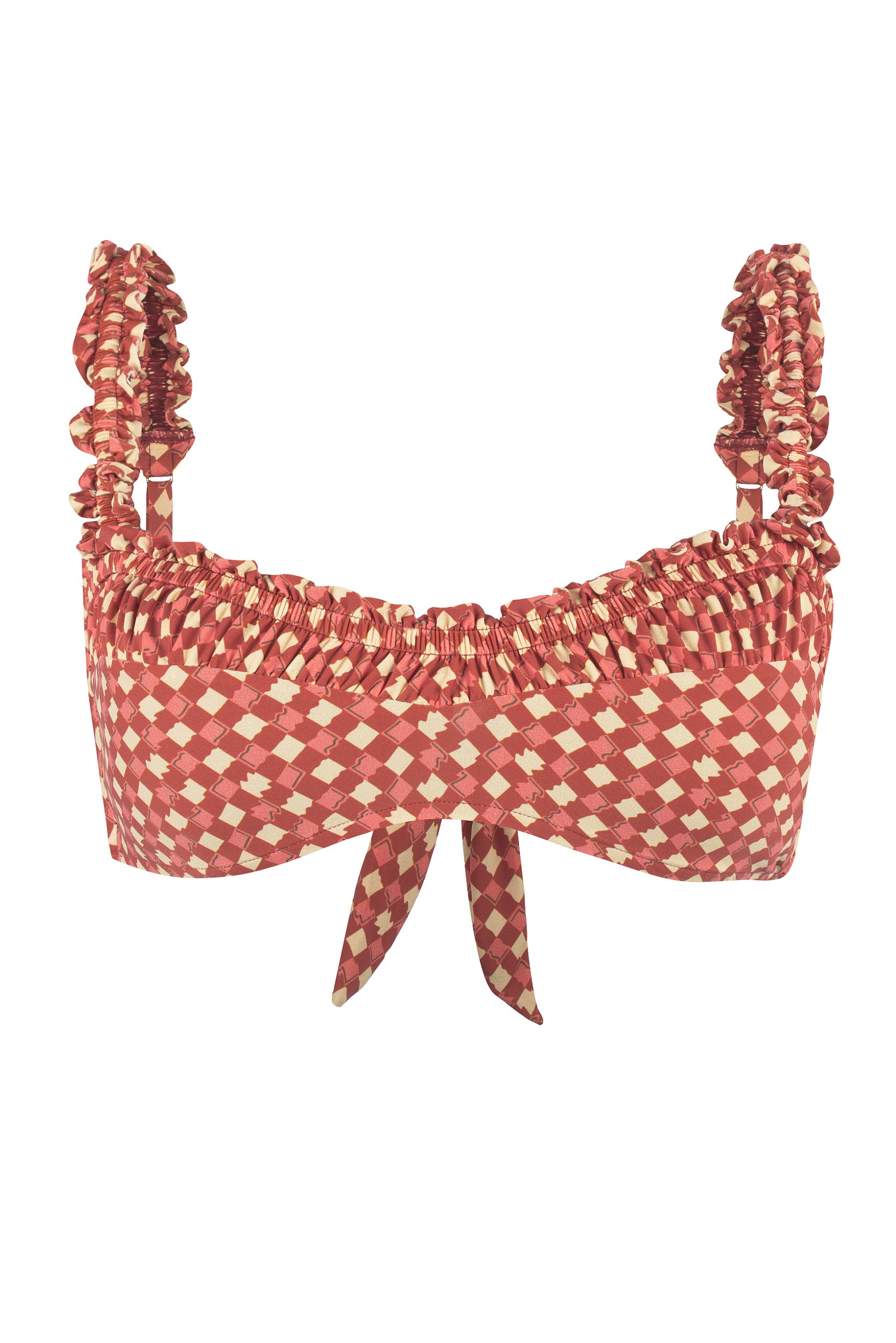 Top estampado com modelagem bustiê. Possui detalhe especial de franzido no busto e de frufru nas alças. Possui bojo removível e as alças são reguláveis. Fechamento nas costas por laço. Confeccionado em tecido macio e confortável, de rápida secagem, composto por poliamida e elastano. Possui forro duplo.