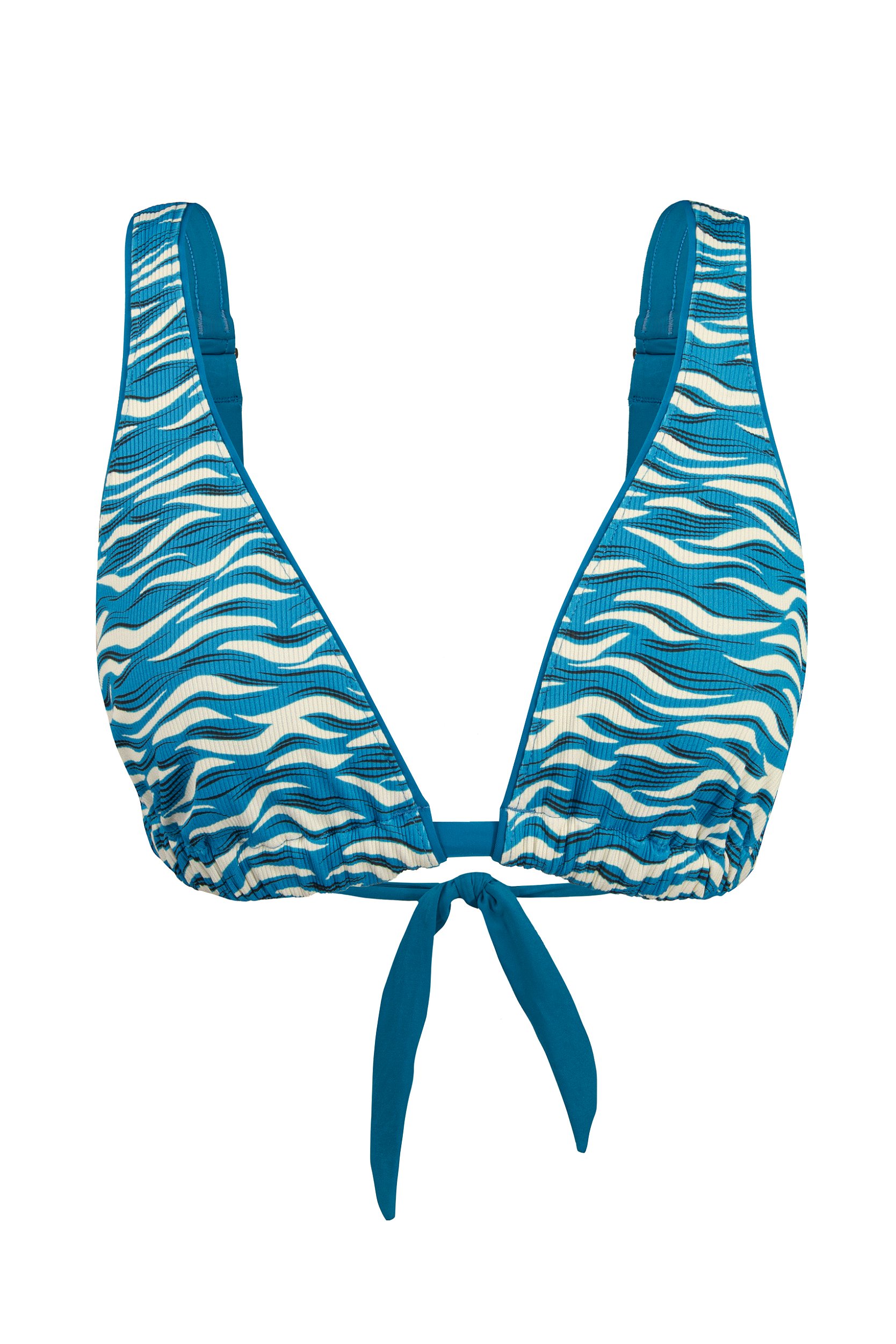 Top triângulo estampado. Possui base móvel, alças largas, retas e reguláveis, detalhes em tecido liso contrastante. Possui bojo removível e amarração nas costas. Confeccionado em tecido texturizado, macio e confortável, de rápida secagem, composto por poliamida e elastano.