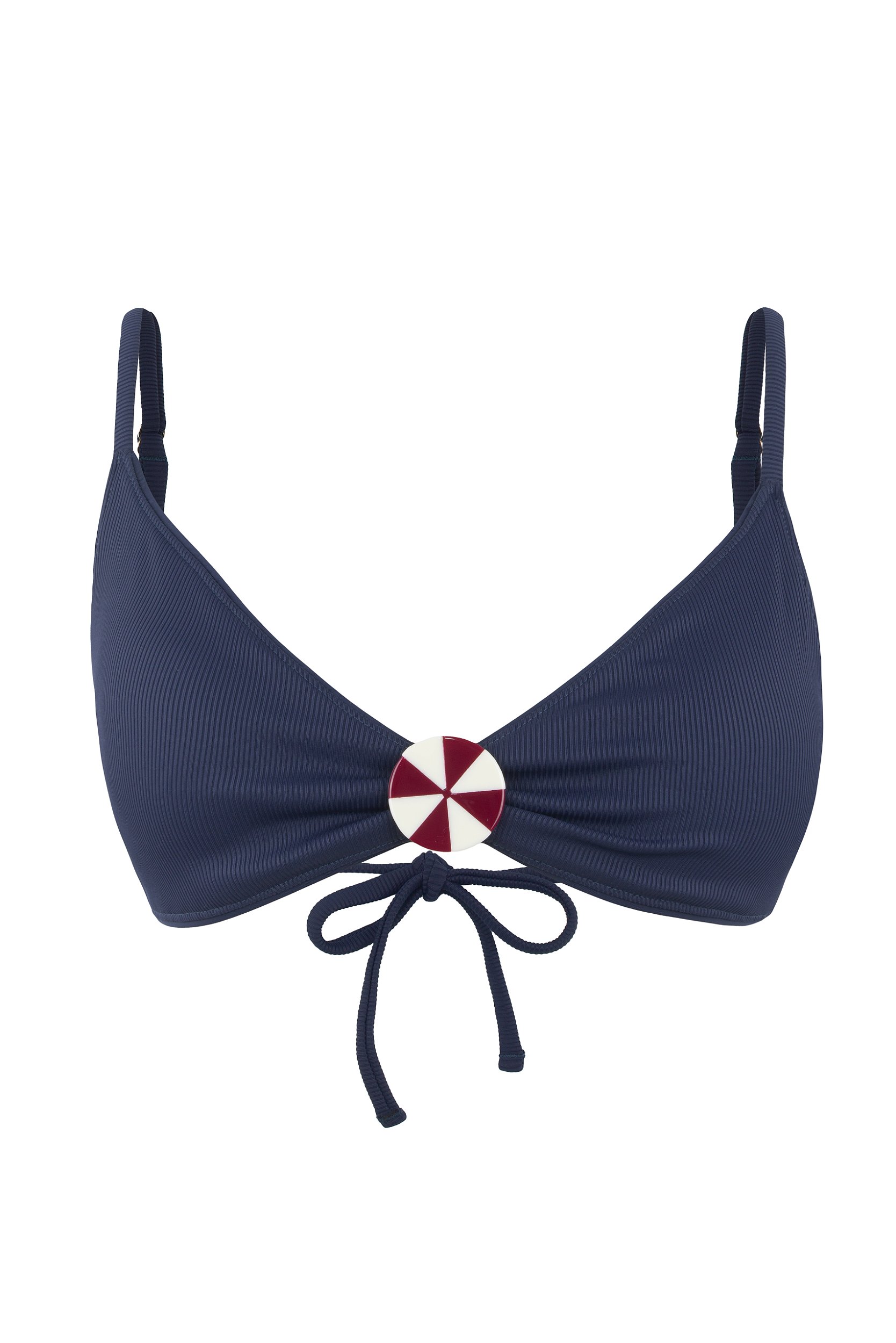 Top com passante central de marchetaria manual em acrílico. Alças retas com regulagem. Possui bojo removível. Confeccionada em tecido com textura listrada, composto por poliamida e elastano.