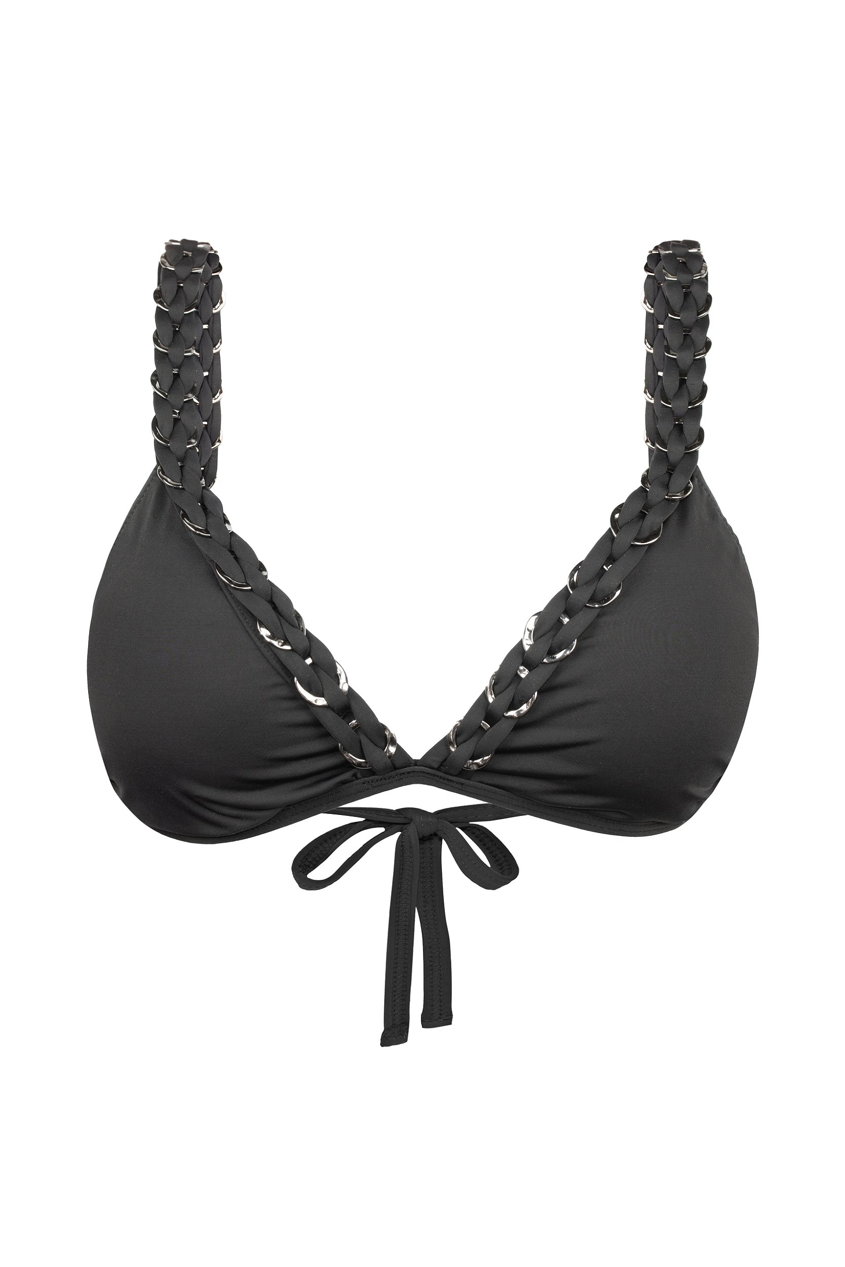 Top com modelagem triangular com cós fixo. Alças com detalhe feito à mão, de argolas de metal na cor ônix entrelaçadas com tecido. Possui bojo removível. Confeccionado em tecido macio e confortável, de rápida secagem, composto por poliamida e elastano. Possui forro duplo.