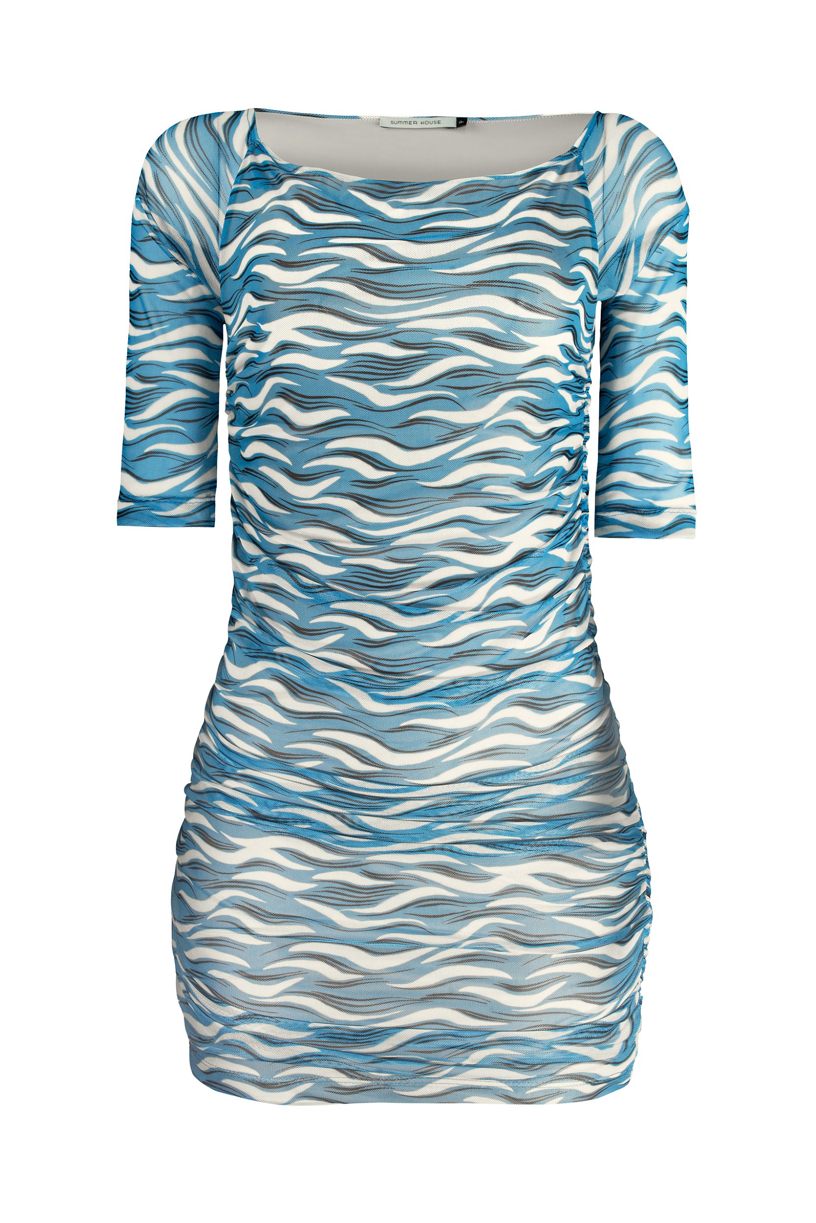 Vestido curto estampado, franzido nas laterais e ajustado ao corpo. Possui forro frente e costas. Confeccionado em tule macio e com rápida secagem. Composto por poliéster com elastano.