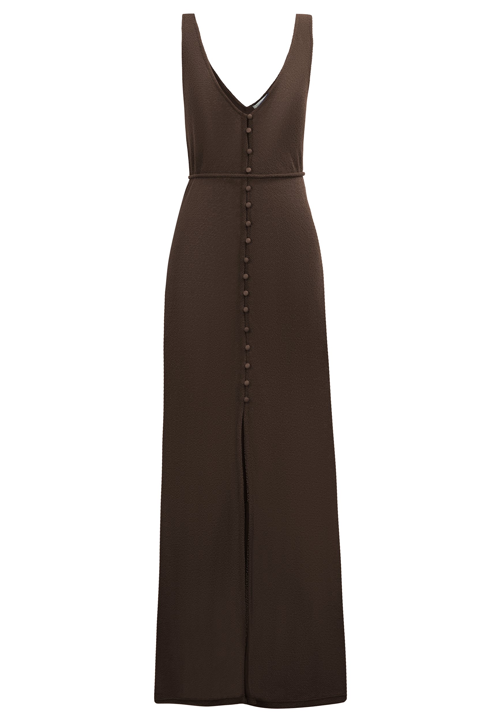 Vestido longo com fendas laterais e abertura frontal com botões. Acompanha cordão solto do próprio tecido para acinturar a peça. Confeccionado em malha com aspecto de tricot, com viscose na composição. Não possui forro.