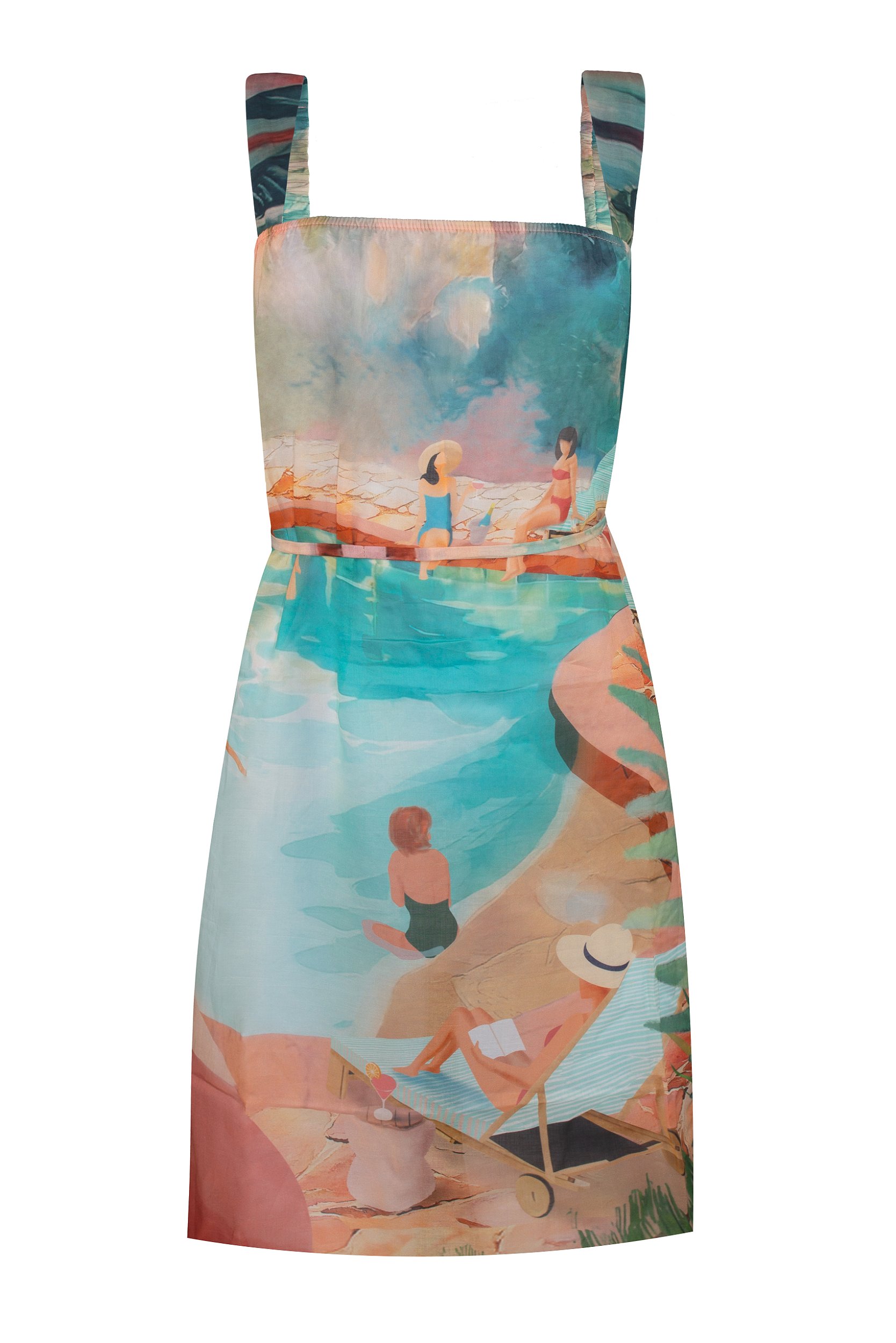 Vestido curto com a Ilustração exclusiva La Piscine. Possui alças retas e elástico no decote. Acompanha um cinto removível do próprio tecido. Confeccionado em voil, tecido super leve de algodão.